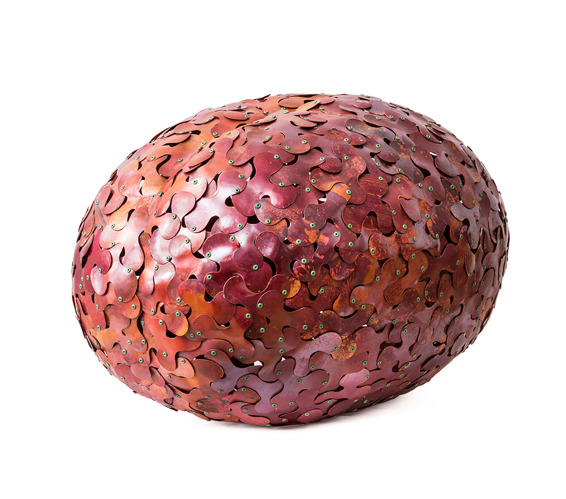 The processing of the various metal’s influences both form and expression. In some works, wear in the metal from prior use is clearly visible, and there is an intention to preserve as much of the original patina as possible. The surface of the materials plays a significant role in the expression of the forms.