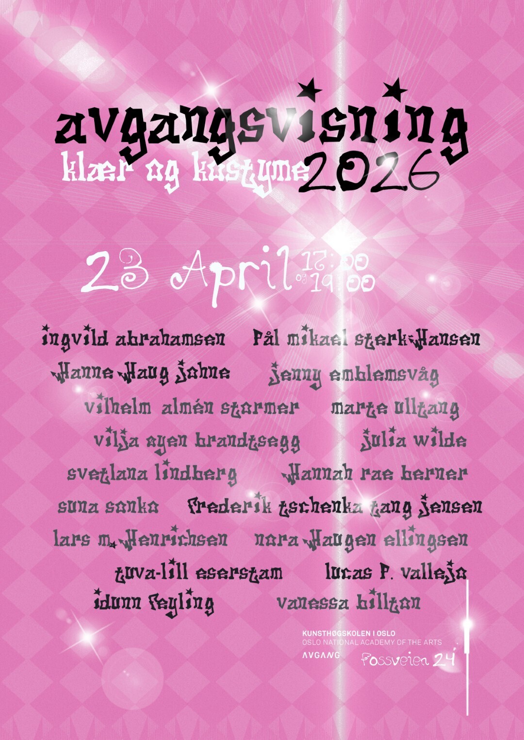 Kunsthøgskolen i Oslo inviterer til avgangsvisning for bachelor- og masterstudenter i klesdesign og kostymedesign torsdag 24. april i Katedralen. Visningen presenteres to ganger, kl. 17.00 og 19.00, og gir et innblikk i arbeidene til en ny generasjon designere. Med utgangspunkt i utforskning, materialitet og iscenesettelse åpner kvelden for møter mellom kropp, plagg og publikum.