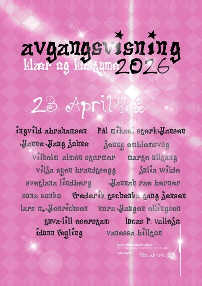Avgang 2026 dokumenterer avgangsarbeid for mer enn 200 studenter ved årsstudier, bachelorstudier og masterstudier på KHiO. Gjennom hele våren presenteres unike kunstproduksjoner og resultater av studentenes avsluttende arbeid.